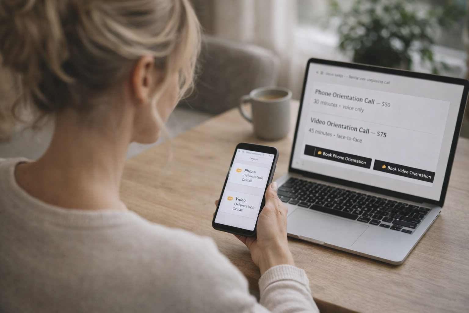 After booking, you’ll receive a brief intake form to complete before our call. This allows us to arrive focused, grounded, and aligned — so the conversation is intentional and useful.